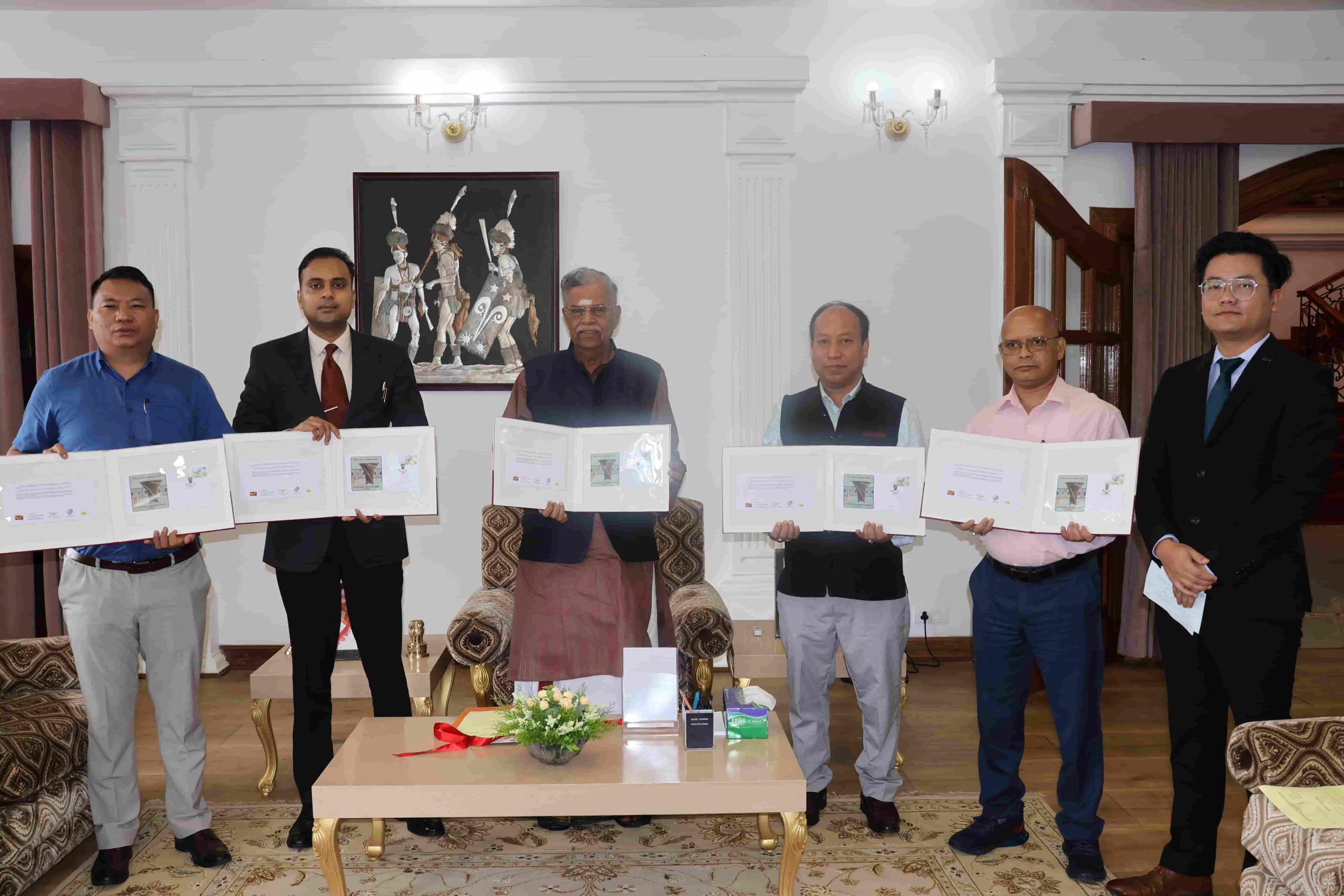 Governor of Nagaland La Ganesan with Secretary to Governor Rajesh Soundararajan, Jt. Secy. and Postal officials during the releasing of Postal Cover on Naga Back Basket at Raj Bhavan on 13 July 2023